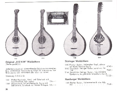 im Gewa-Katalog von ca. 1960 wird sie aber gar nicht als "echte Böhm-Waldzither" sondern mit der Nr. 1140 als Thüringer Waldzither mit flachem Boden und Embergher Kopf angeboten. Aber auch auf der Katalogabbildung ist der Böhm-Waldzither Zettel im Schallloch zu erkennen.